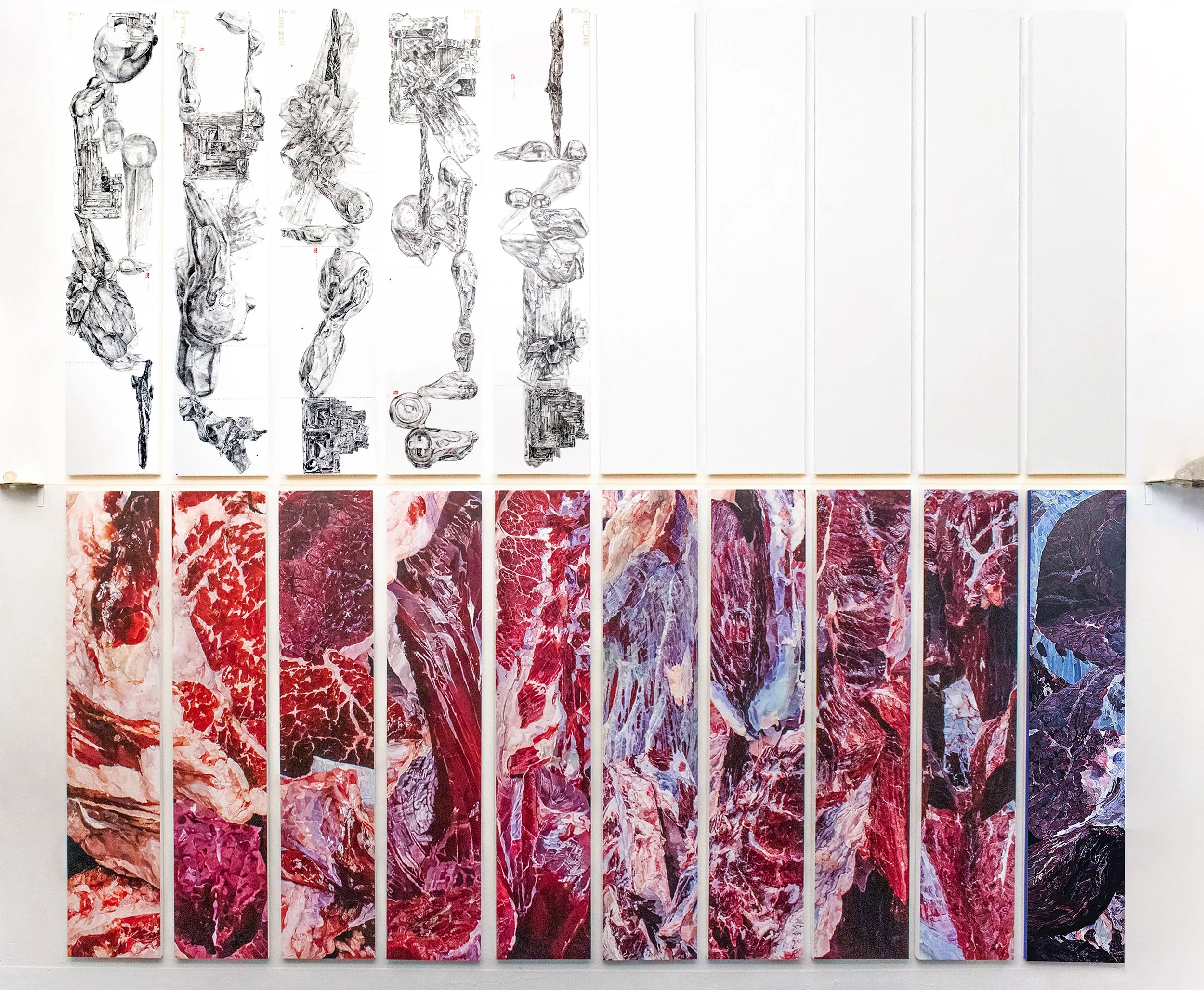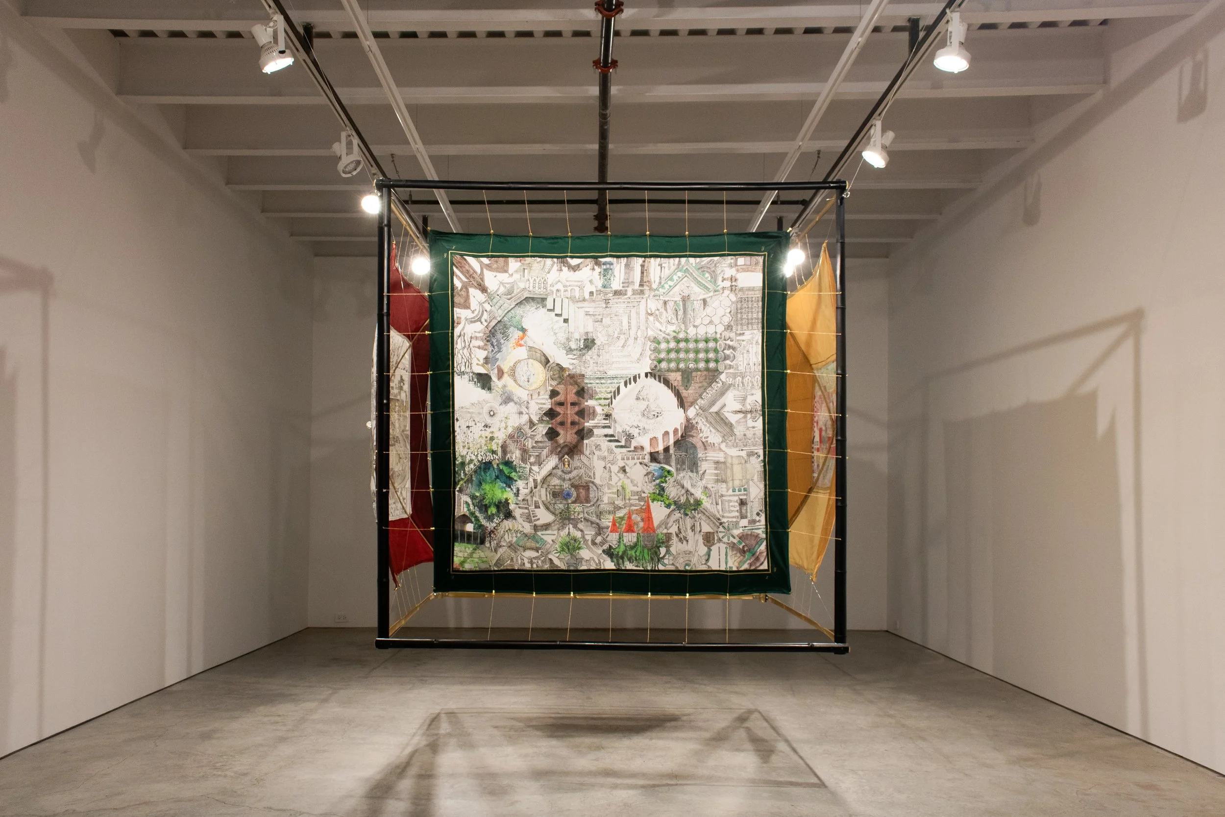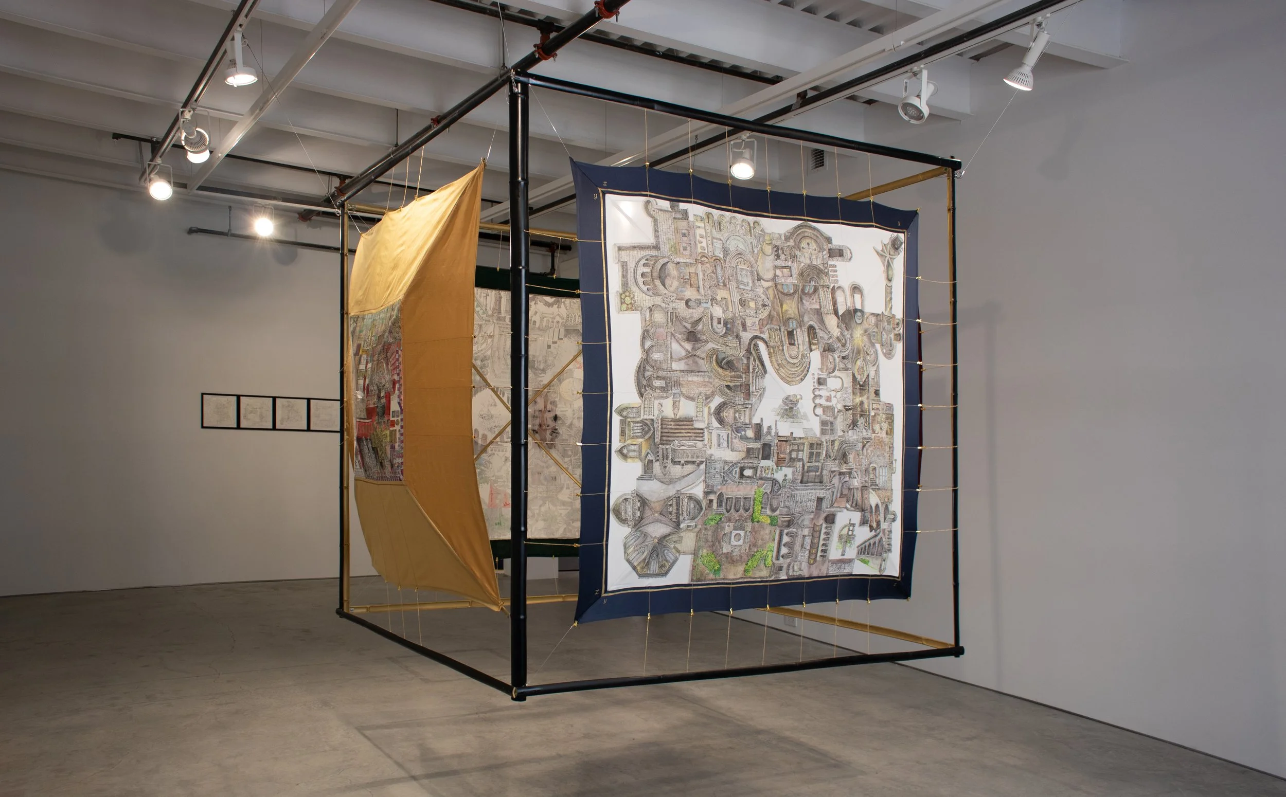 My work, Uncanished Workld, is a series of installations combining drawing, sculpture, painting, printmaking, and text, creating a virtual world with mythological and narrative qualities. It makes visible the gap between individual perception and the world, exploring the systems humans have built to understand and impose order on reality. I focus on religious belief systems as one such structure, analyzing and deconstructing their constituent elements—myth, architecture, and religious imagery. I then reassemble with mathematical structures and scientific references to form the fundamental components of Uncanished Workld, such as time, space, terrain, and calendars. Each project functions as a chapter addressing a fundamental unit of Uncanished Workld, with scientific and mathematical diagrams, religious iconography, and mythological imagery to connect the chapters and shape the world. The name of this world reflects its meaning: its uncanny aspect signifies the impossibility of fully grasping reality, while its unfinished aspect indicates that the pursuit of understanding never ends. Like its name, this world can be described through language, yet it cannot be fully articulated or captured; this quality allows me to explore and reveal how human belief and imagination understand and construct meaning within the world.