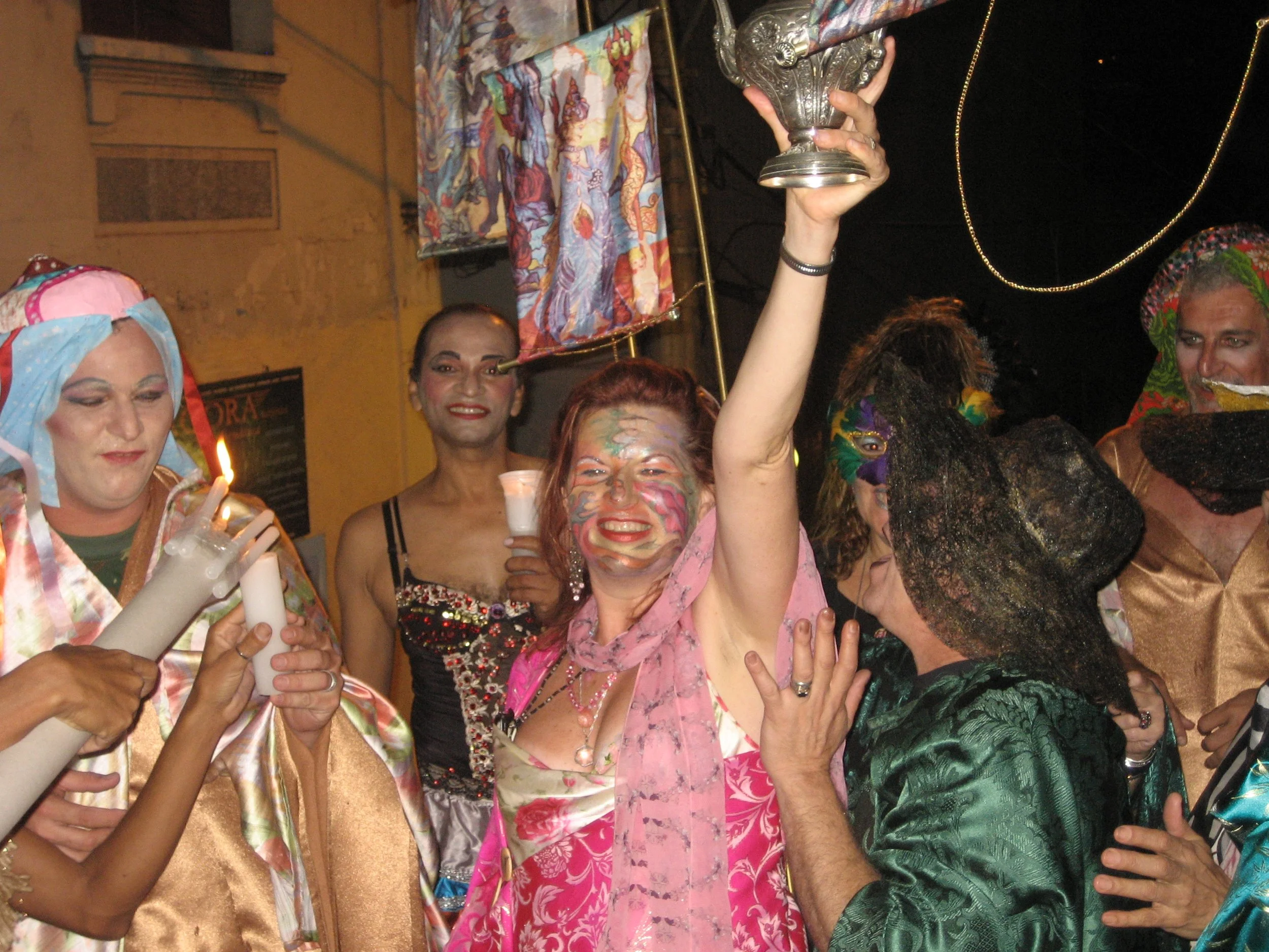 The Puki Procession was started in conjunction with David Medalla to protest the invasion of Iraq, and destruction of cultural antiquities. It is a participatory performance with the paintings on silk banners, which are paraded to protest monuments, museums as mausoleums, and honor private places in public gardens. Reveling and revealing the grotesque, the Pukis have performed in Brazil, Chile, London, Liverpool, Rome, Paris, Berlin, Brooklyn and Peekskill N.Y., and in Freehold and Newark, New Jersey. They have been in one person exhibitions in Brazil, Liverpool, and twice at Studio Ra in Rome. Pukis use the public pulpit to create a praxis of pop propaganda: a sort of visual punditry.